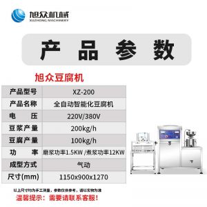 XZ-300型氣動壓榨豆腐機,智能豆腐豆?jié){機,雙桶煮漿高效生產現磨現煮,漿渣分離快速出漿。機器運行穩(wěn)定不銹鋼材質打造,堅固耐用,安全衛(wèi)生,時尚大方,易于清洗。
