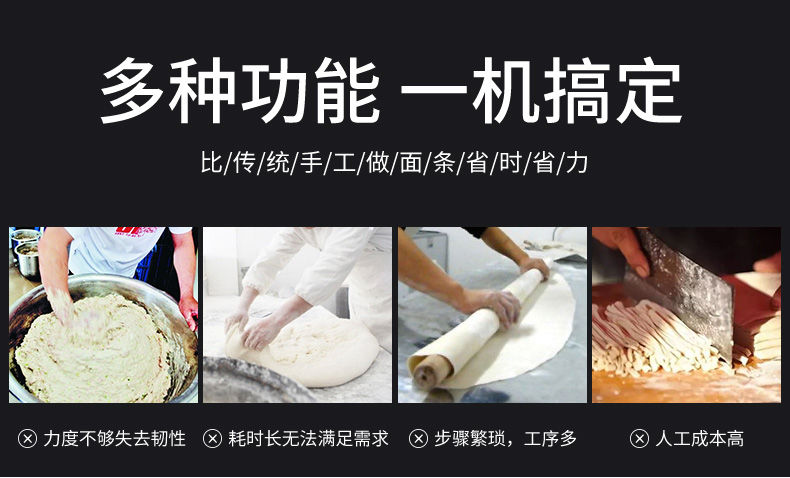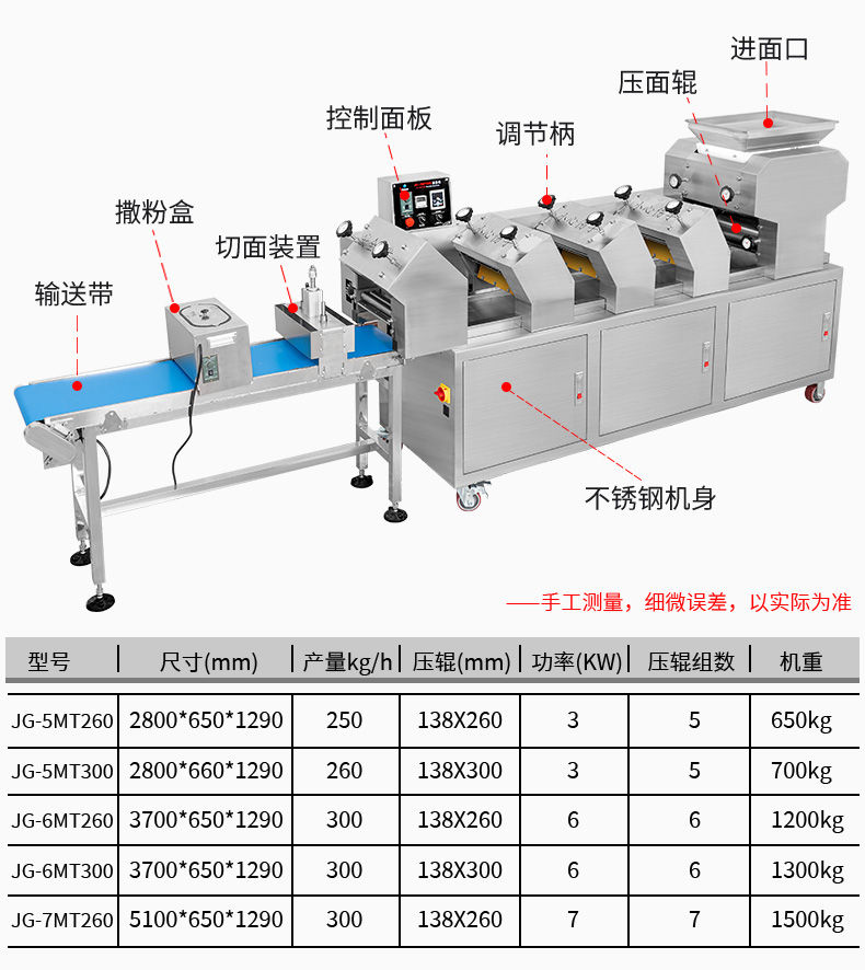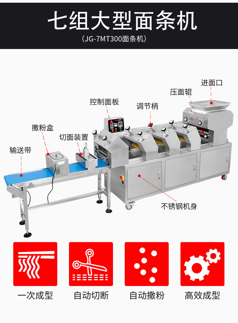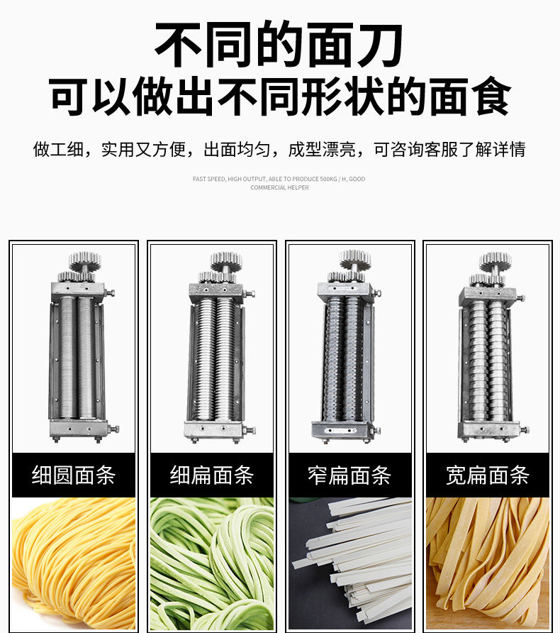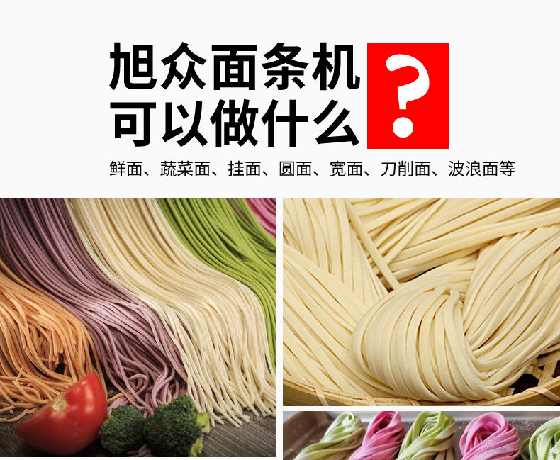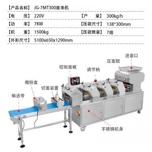JG-7MT300面條機(jī),多種功能一機(jī)搞定比傳統(tǒng)手工做面條,省時(shí)省力。可以做什么鮮面、蔬菜面、掛面、圓面、寬面、刀削面、波浪面等。不同的面刀可以做出不同形狀的面食做工細(xì),實(shí)用又方便,出面均勻,成型漂亮。