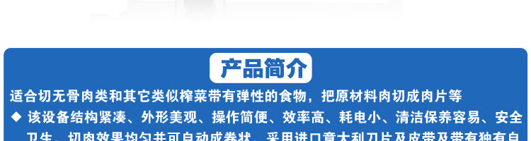 臺(tái)式全自動(dòng)切片機(jī),適合切無骨肉類和其他類似榨菜帶有彈性的食物,把原材料肉切成肉片,并可自動(dòng)成卷狀??汕信H馄?、羊肉片等