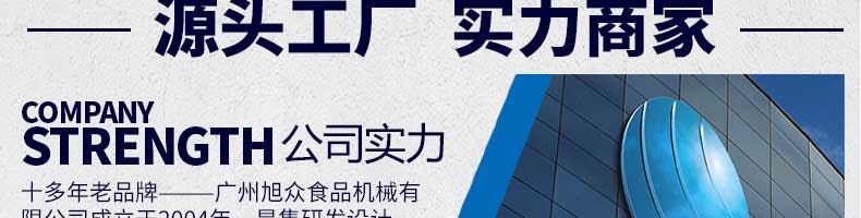 廣州旭眾食品機械有限公司是一家集科研開發(fā),生產(chǎn)設計,營銷服務為一體的現(xiàn)代化生產(chǎn)企業(yè)?,F(xiàn)代化生產(chǎn)車間,精湛制造技術,所產(chǎn)機械歷經(jīng)市場重重考驗,不斷贏得海內(nèi)外客戶的贊譽。