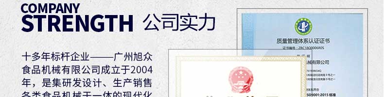 廣州旭眾食品機(jī)械有限公司是一家集科研開發(fā),生產(chǎn)設(shè)計,營銷服務(wù)為一體的現(xiàn)代化生產(chǎn)企業(yè)?,F(xiàn)代化生產(chǎn)車間,精湛制造技術(shù),所產(chǎn)機(jī)械歷經(jīng)市場重重考驗,不斷贏得海內(nèi)外客戶的贊譽(yù)。